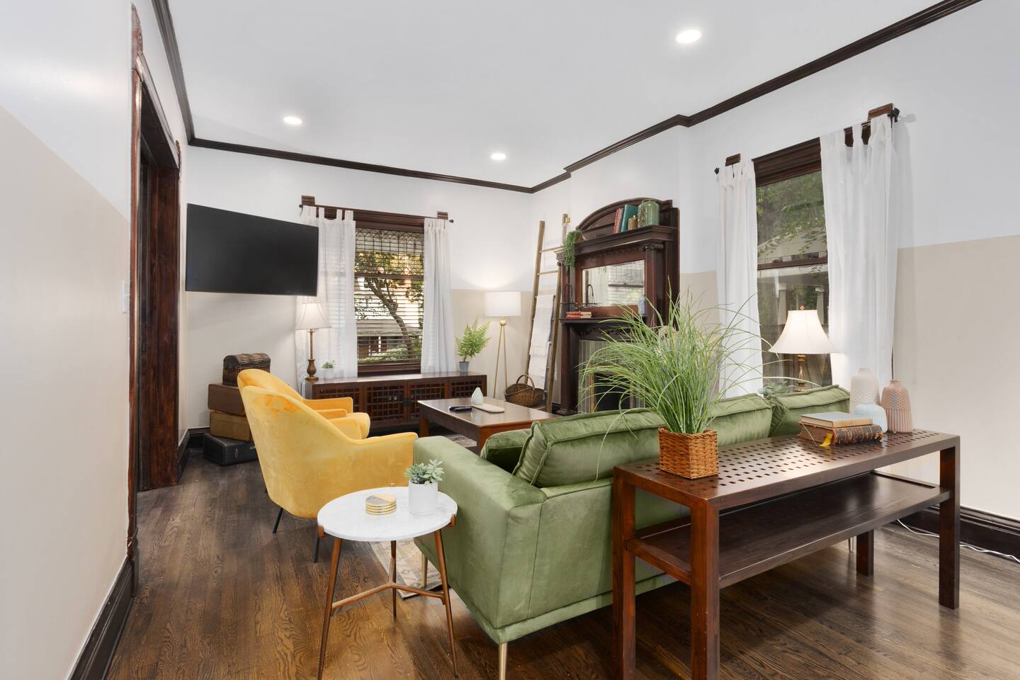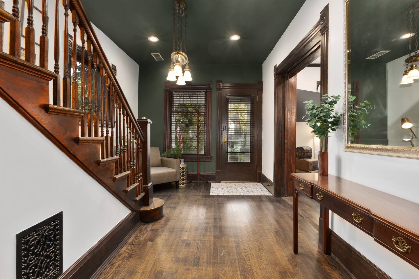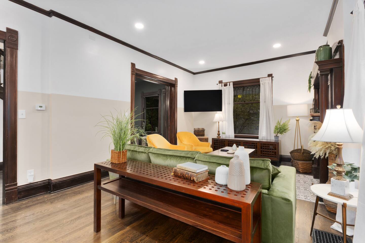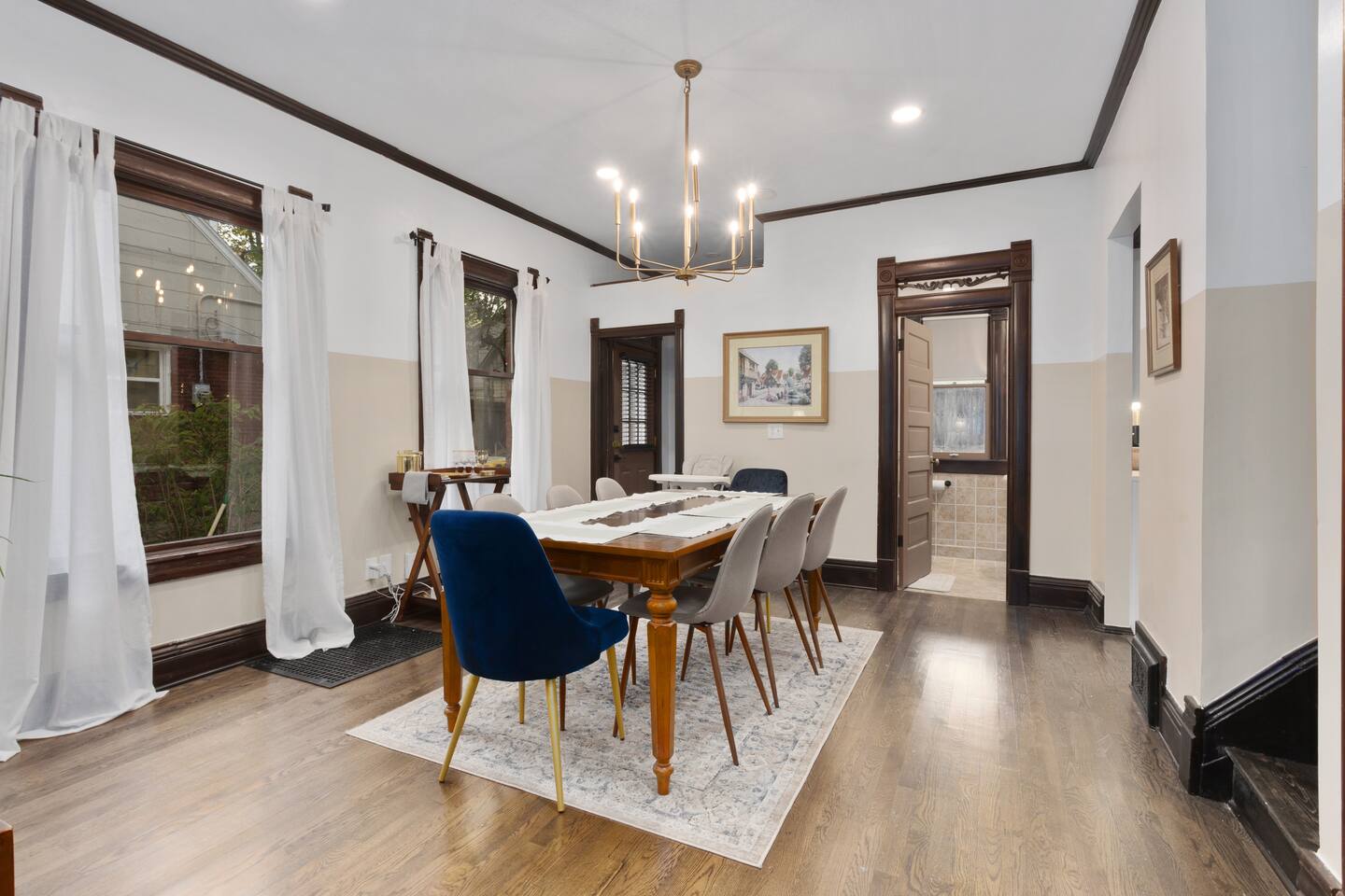 Discover timeless elegance in this beautifully restored 3-level home where 1910s charm meets modern luxury. Original hardwood floors and meticulously restored crown molding showcase authentic character, while soaring ceilings create an airy, grand atmosphere. The main floor flows seamlessly from living room to dining area, connecting to a fully-equipped kitchen, laundry room, and stylish full bath. The second floor features three comfortable bedrooms - two with plush king-size beds, one with queen - plus a spa-like bathroom with jacuzzi tub, separate shower, and double vanity. The top floor offers twin beds, workspace, entertainment area, and reading nook. Enjoy the charming front porch or relax in your private fenced backyard. This stunning blend of historic authenticity and modern amenities creates the perfect refined getaway. NOTE: The staircase to the third floor is a bit narrow and steep