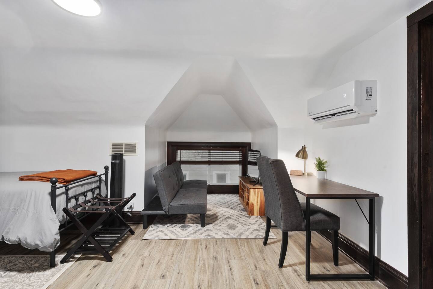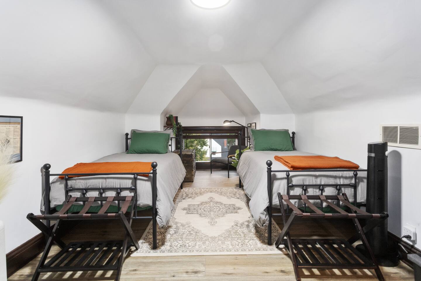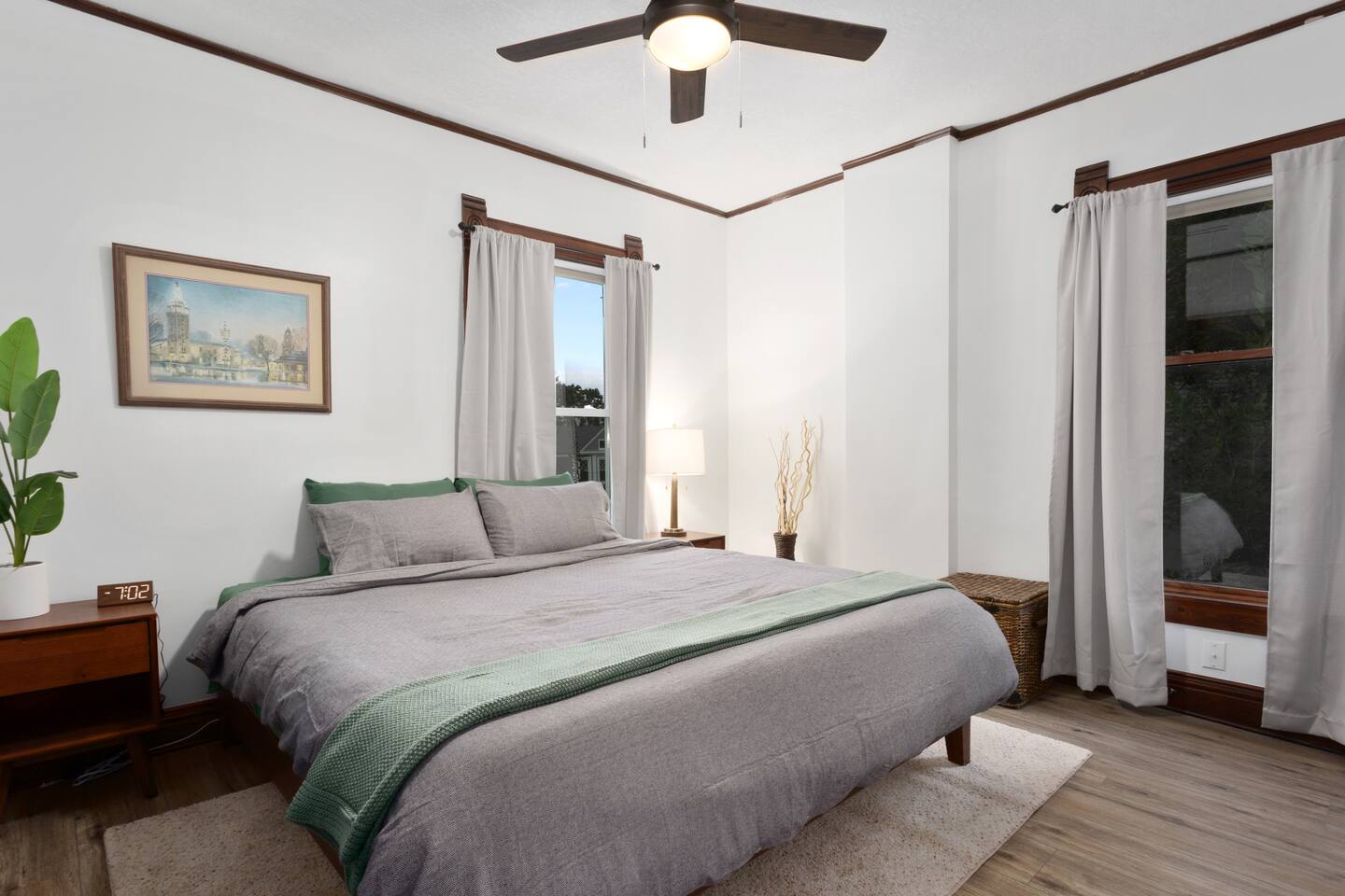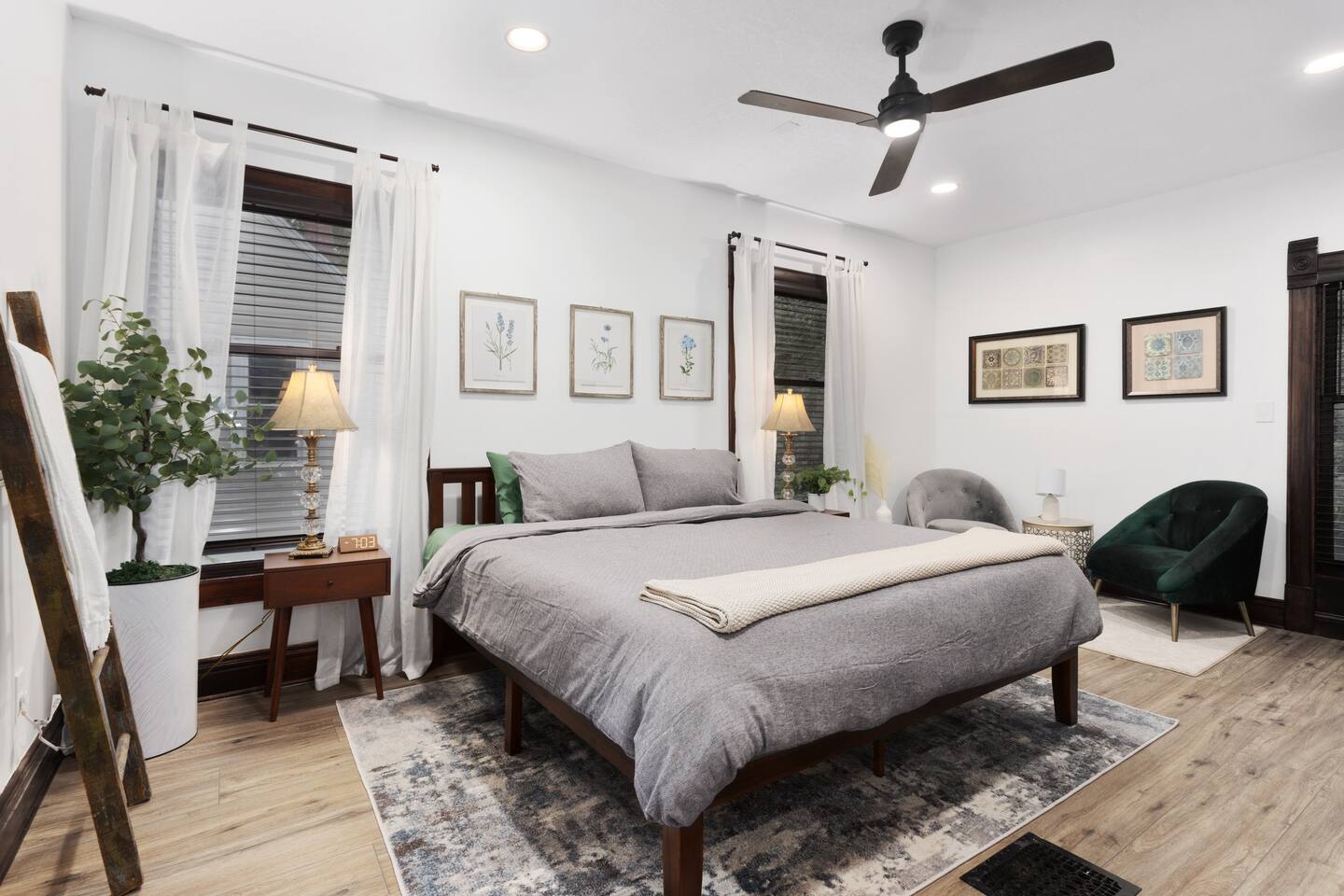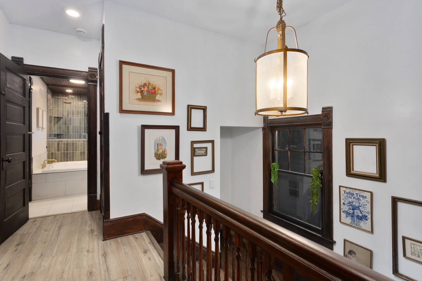 Discover timeless elegance in this beautifully restored 3-level home where 1910s charm meets modern luxury. Original hardwood floors and meticulously restored crown molding showcase authentic character, while soaring ceilings create an airy, grand atmosphere. The main floor flows seamlessly from living room to dining area, connecting to a fully-equipped kitchen, laundry room, and stylish full bath. The second floor features three comfortable bedrooms - two with plush king-size beds, one with queen - plus a spa-like bathroom with jacuzzi tub, separate shower, and double vanity. The top floor offers twin beds, workspace, entertainment area, and reading nook. Enjoy the charming front porch or relax in your private fenced backyard. This stunning blend of historic authenticity and modern amenities creates the perfect refined getaway. NOTE: The staircase to the third floor is a bit narrow and steep