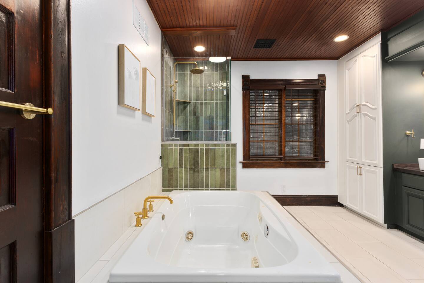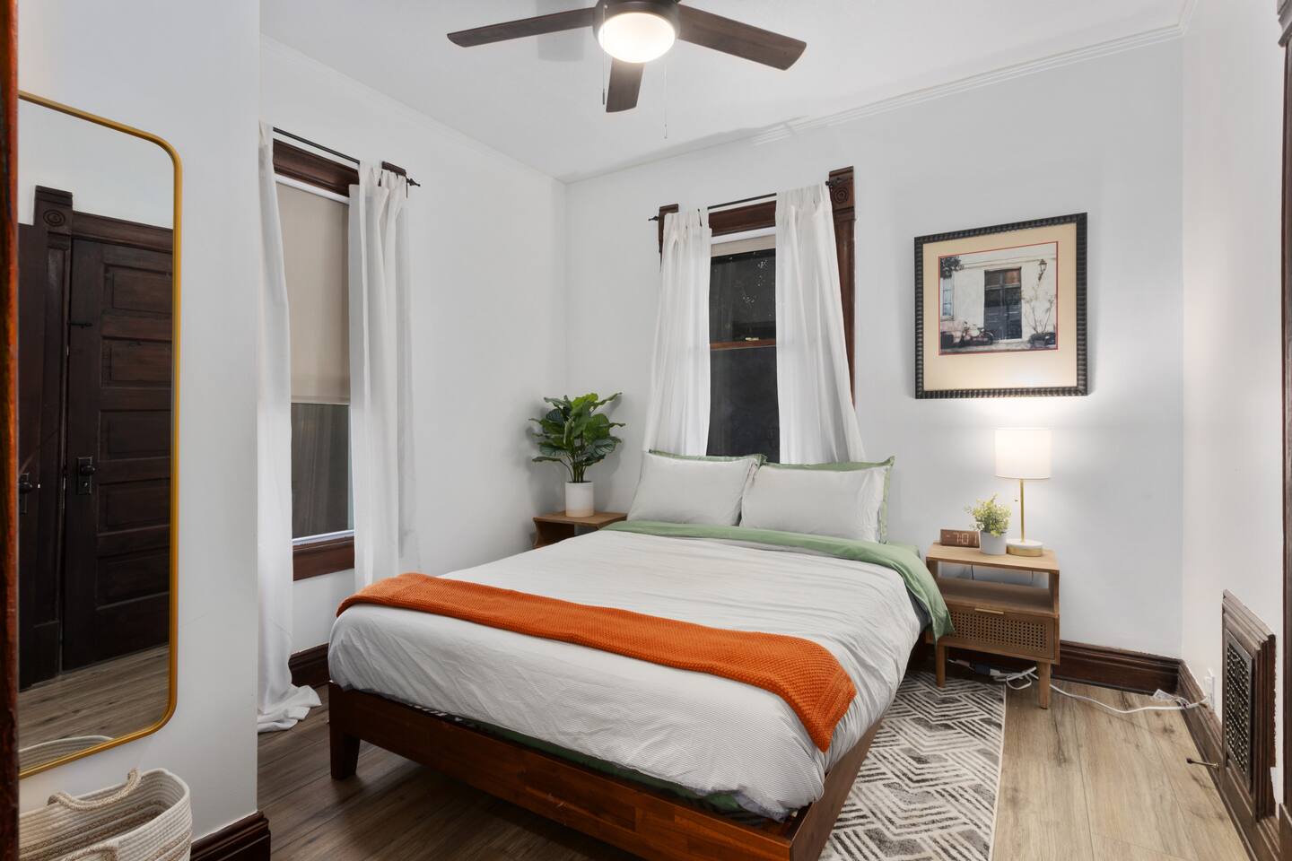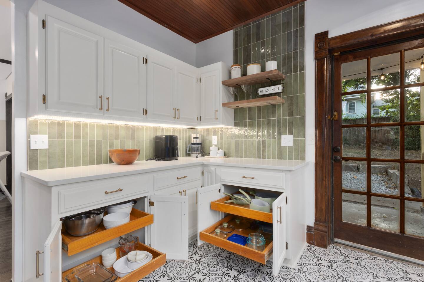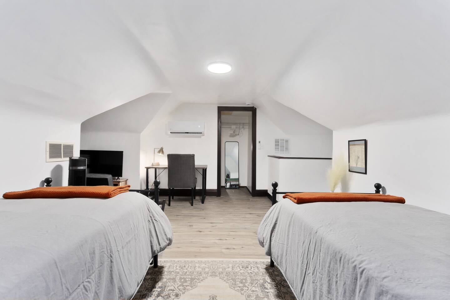 Discover timeless elegance in this beautifully restored 3-level home where 1910s charm meets modern luxury. Original hardwood floors and meticulously restored crown molding showcase authentic character, while soaring ceilings create an airy, grand atmosphere. The main floor flows seamlessly from living room to dining area, connecting to a fully-equipped kitchen, laundry room, and stylish full bath. The second floor features three comfortable bedrooms - two with plush king-size beds, one with queen - plus a spa-like bathroom with jacuzzi tub, separate shower, and double vanity. The top floor offers twin beds, workspace, entertainment area, and reading nook. Enjoy the charming front porch or relax in your private fenced backyard. This stunning blend of historic authenticity and modern amenities creates the perfect refined getaway. NOTE: The staircase to the third floor is a bit narrow and steep