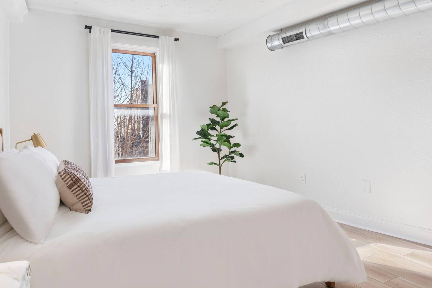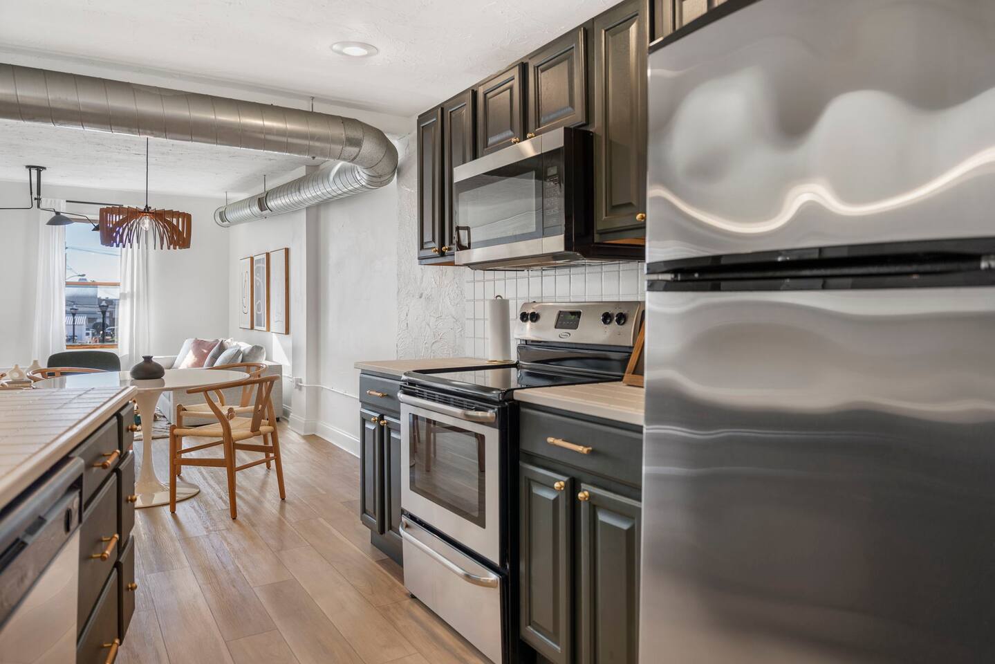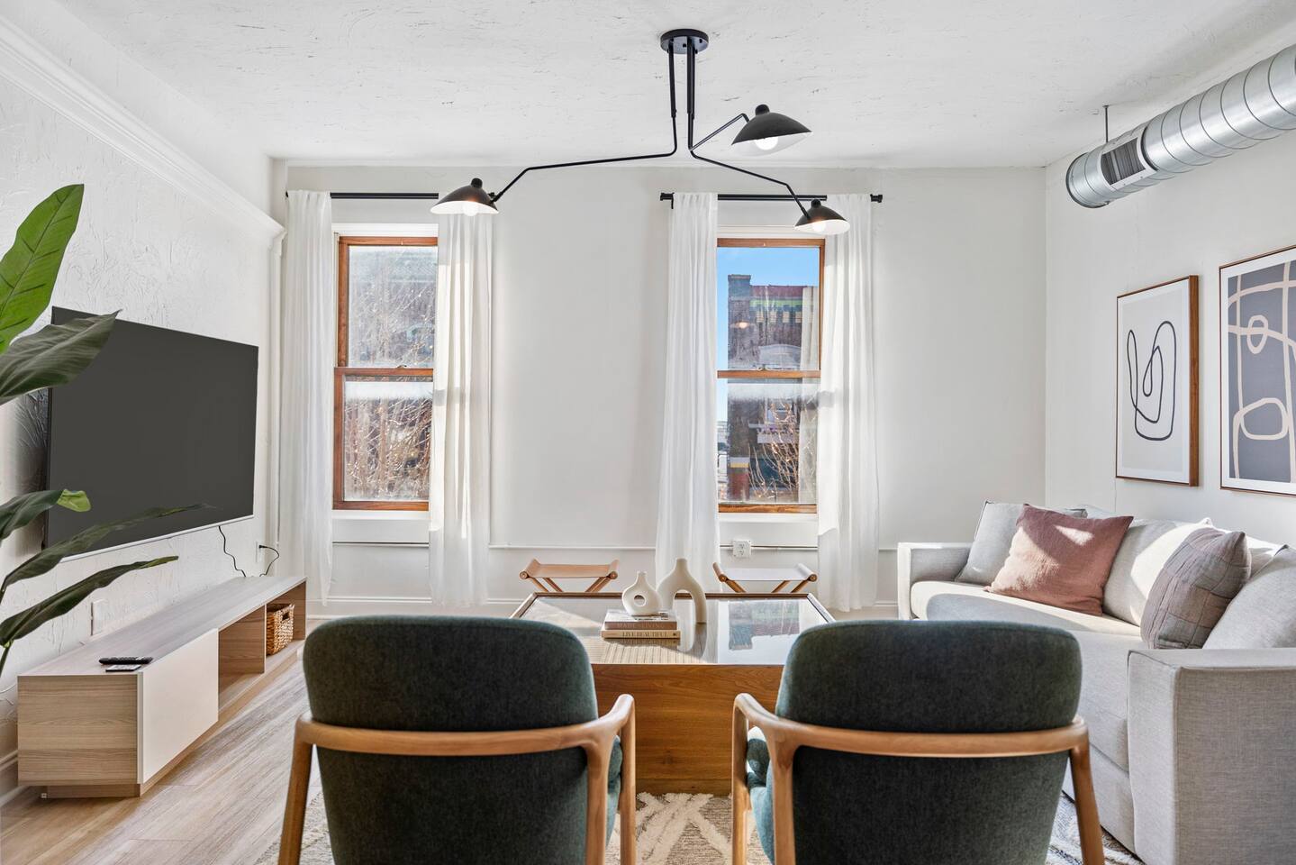 Welcome to your modern loft oasis in the heart of historic downtown Springfield! This recently renovated 1-bedroom, 1-bath apartment blends old-world charm with contemporary living. Inside, you'll love the open-concept design, tall ceilings, and huge windows that flood the space with natural light, making it feel bright and airy. The spacious living area features a large smart TV for easy streaming of your favorite shows and a comfortable layout that's perfect for both relaxing and working. High-speed internet makes remote work or video calls a breeze. The fully equipped kitchen comes stocked with essential cookware, dishes, and utensils — whether you're preparing a simple meal or settling in for a longer stay, you’ll have everything you need. Located right on Commercial Street, you’ll be steps away from some of Springfield’s best local cafes, restaurants, boutique shops, and art galleries. The building offers a charming historic vibe while being perfectly situated for urban convenience. Free street parking is typically available nearby. This loft is ideal for traveling nurses, remote workers, or anyone seeking a unique and comfortable extended stay in Springfield.