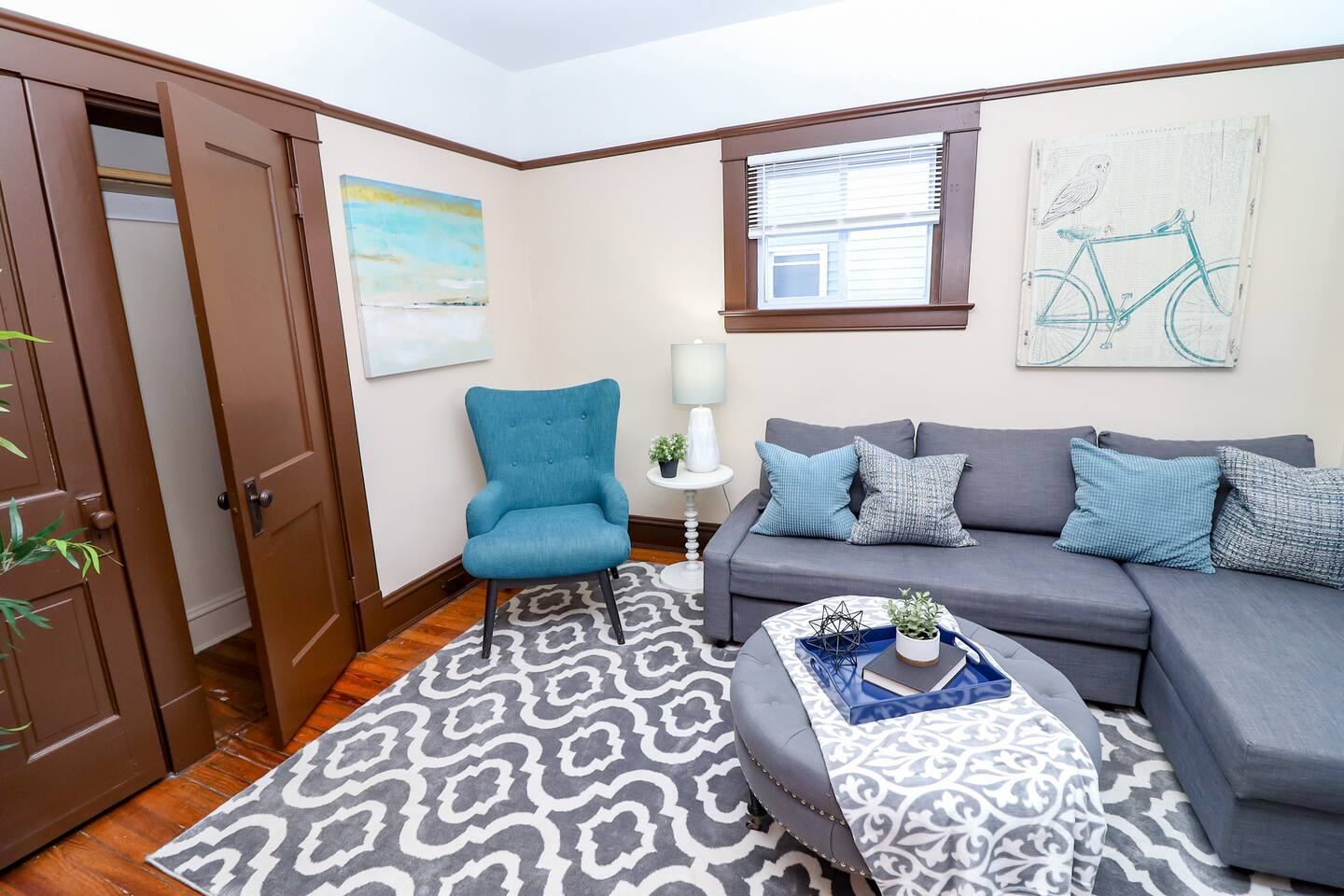 Welcome to your bright, renovated home-away-from-home in Lakewood! This stylish 1BR/1BA apartment features huge front windows, a cozy queen bed, a pull-out sofa for guests, and in-unit laundry. Quiet yet minutes from shopping, dining, parks, and hospitals.